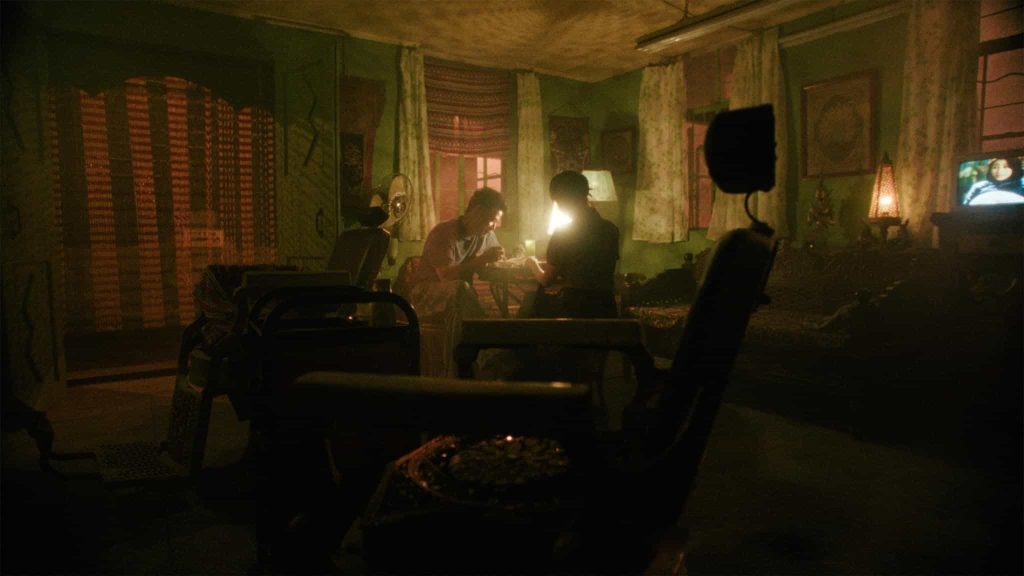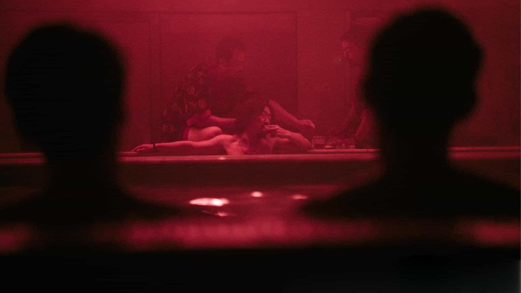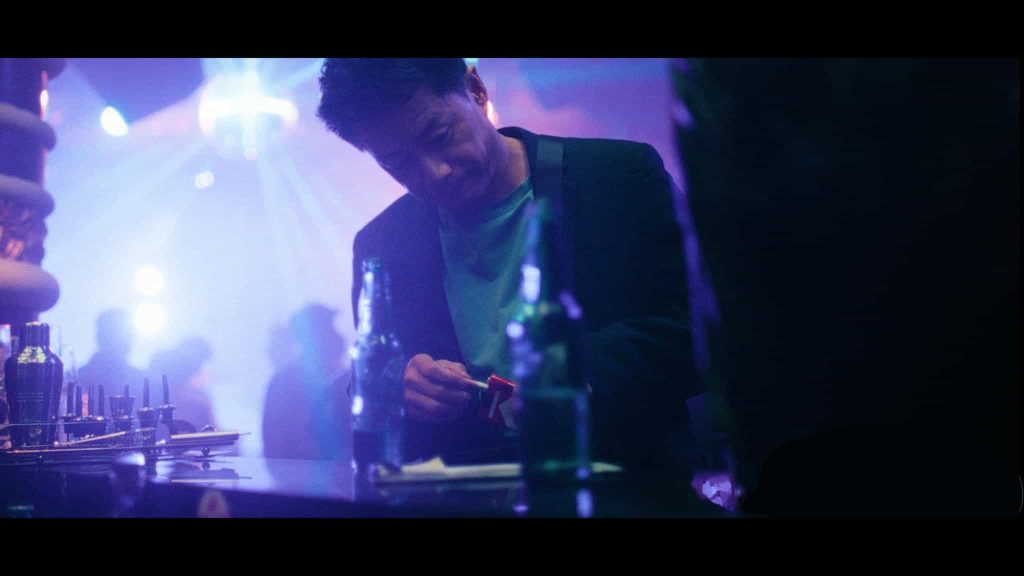 杰影科技:除了色彩,用光也极具戏剧性。您是如何利用光线来刻画人物复杂的内心世界(例如卧底的挣扎、毒枭的疯狂)?在表现缉毒世界的危险与不确定性时,光影设计了哪些特别的处理?柴然:摄影工作对我来说重点在美学和策略的制定,而人物光影造型我更多的是依据人物、情境、现场条件顺着直觉走。一些规律性的处理往往是相似感觉的交叠所致。比如在很多人物的画面中都会有一个“刺点”式的高光,来视觉化角色的生存意志,这与其说是设计不如说是一种画面意识。再比如,本片很有特色的缉毒警的光线造型,我完全抛弃刻板的正面人物的打光方法,而是深入理解缉毒警的生存处境,他们是常年游弋在正邪之间、终身潜伏在污水之下,所以我总是用幽微、暧昧的暗调来处理他们的面部;而需要展露他们作为“降魔者”的杀气时,又会用到非常尖锐的高光来刻画;他们面部的反差更深刻揭示了难言的内心交战。比如第二集林强峰重返案发现场的戏:红色纱帘与粉红灯光构成一种魅惑的气息,手电筒光自下而上打在他脸上,形成块状高光,塑造出犹如寺庙护法般的凶恶煞气。而我认为这才是社会守卫者力量的展现。